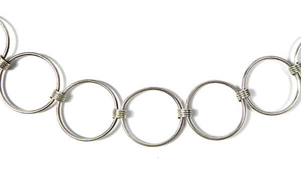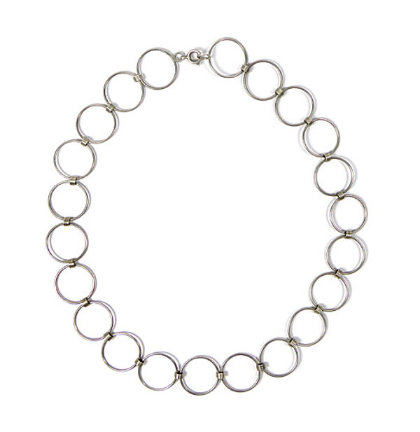 Silbernes Collier (800er) aus roßen, zarten ringförmigen Gliedern, die mit feinenSpiral-Elementen verbunden sind. Ringösenverschluss. Länge ca. 42,5 cm, ungeputzter Zustand mit leichter Patina und geringen Tragespuren. Ungemarkt, wohl Deutschland der 1920er bis 50er Jahre.