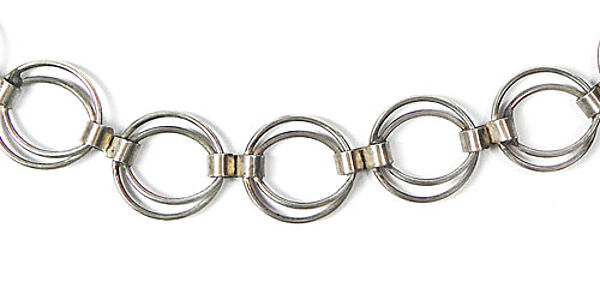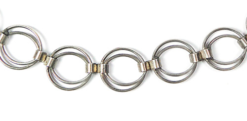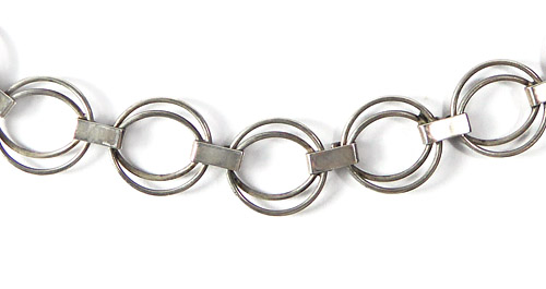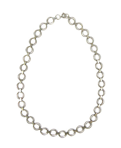 Silbernes Collier (835er), dessen Glieder aus zwei unterschiedlich großen, zarten Ringen bestehen, die durch schmale bandförmige Klammern miteinander verbunden sind. Ringösenverschluss. Kettenlänge ca. 46 cm, ungeputzter Zustand mit leichter Patina und geringen Tragespuren. Ungemarkt, wohl Deutschland der 1920er bis 50er Jahre.