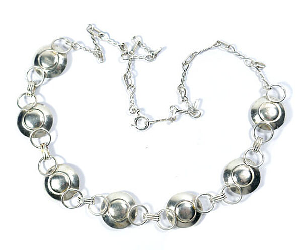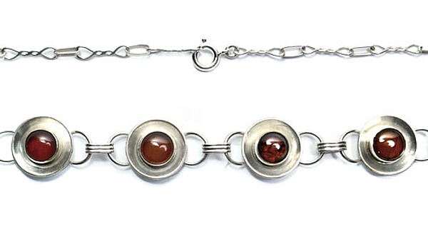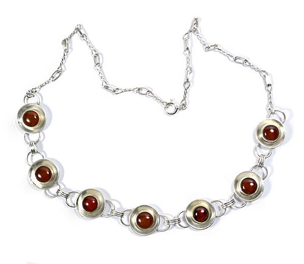 Silbernes Collier (835er), vorderseitig sind sieben scheibenartige Glieder integriert, die mittig jeweils einen orange-braunen, semiluziden Bernstein-Cabochon in Zargenfassung tragen und durch relativ große Ringelemente verbunden sind. Zarte Kette mit verdrillten Gliedern, Ringösenverschluss (erneuert). Länge ca. 45 cm, geputzter Zustand mit geringen Tragespuren. Rückseitig bezeichnet mit "6." (ungedeutet), ungemarkt, wohl Deutschland der 1920er bis 40er Jahre.
