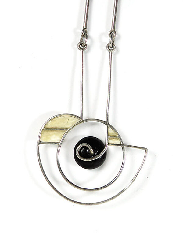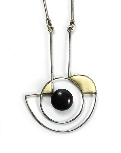 Silbernes Collier (925er). Der Kettenteil besteht aus relativ langen, stäbchenartigen Gliedern, die durch kleine Ringelemente verbunden werden, einfacher Hakenverschluß. Der Anhänger ist offen aus filigranen Draht geformt, außen angedeutet spindel- oder schiff-, innen ringförmig konfiguriert, zentral ist eine linsenförmige Onyxperle fixiert, zwei sich ergebende Felder im oberen Anteil sind mit kleinen Elfenbeinplatten ausgefüllt. Länge des Anhängers ca. 5,8 cm, Breite ca. 4 cm, Kettenlänge ca. 57 cm, ungeputzter Zustand mit leichter Patina und geringen Gebrauchsspuren. Die Formsprache erinnert ein wenig an die Mobile von Alexander Calder der 1950er, 60er Jahre. Aus dieser Zeit dürfte auch das Schmuckstück stammen.