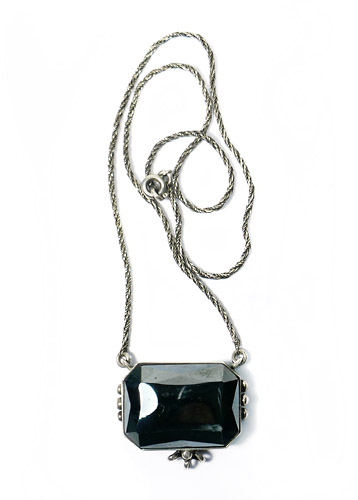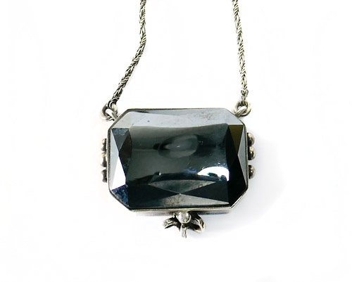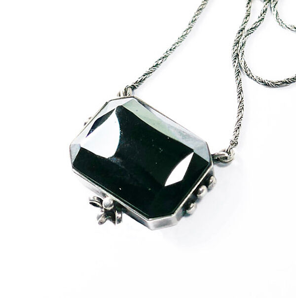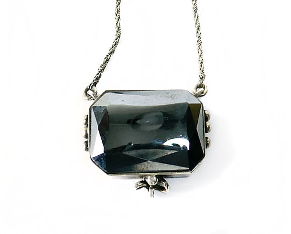 Silbernes Collier (geprüft), welches durch eine mittig angeordnete, achteckig facettierte, zargengefasste Hämatit-Tafel dominiert wird. Seitlich sind ihr kleine Kugelelemente sowie unterseitig eine stilisierte Blüte angesetzt. Oberseitig ist jeweils rechts und links seitlich (gehalten von kleinen Ringgliedern) eine Kordelkette mit Federringschließe fixiert. Gesamtlänge ca. 39 cm, Maße des Mittelstückes ca. 3 x 2,5 cm. Ungeputzter Zustand mit diskreter Patina und geringen Tragespuren. Wohl deutsche juweliersarbeit der 1920er Jahre.