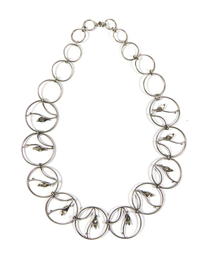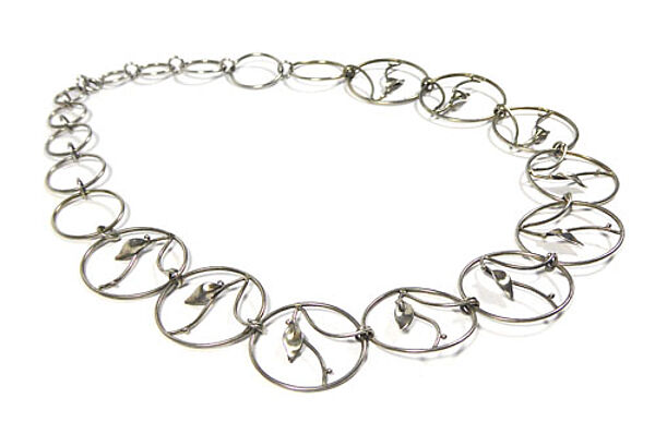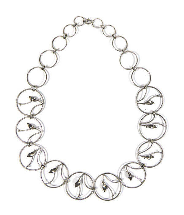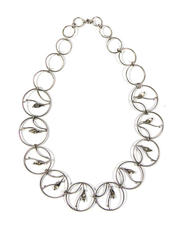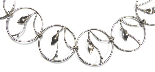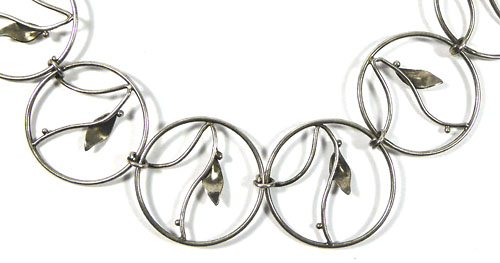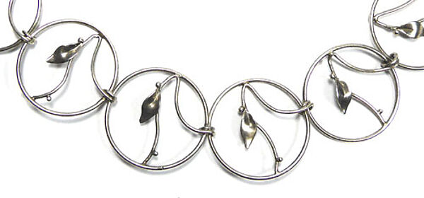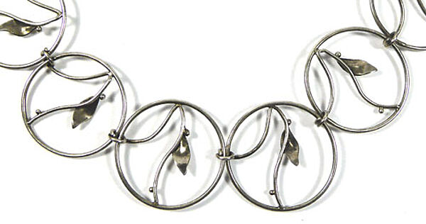 Aufwendig handgefertigtes Silbercollier (800er), bestehend aus miteinander verbundenen Kreiselementen im Verlauf, die jeweils zentral eine stilisierte Pflanze mit gewundenem Stil und einem Blatt zeigen. Ringösenverschluss. Länge ca. 45 cm, grösster Durchmesser der Ringelemente ca. 2,6 cm, ungeputzter Zustand mit leichter Patina und geringen Tragespuren. Gemarkt mit einem sechseckigen Stern. In dem Buch "Schmuck der 20er und 30er Jahre in Deutschland" von Christianne Weber, Arnoldsche Verlagsanstalt, Stuttgart 1990, ist auf S. 223 ein sehr ähnliches Collier - hier allerdings in Gold ausgeführt - abgebildet.