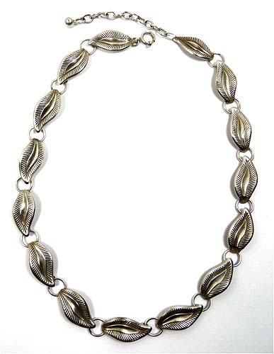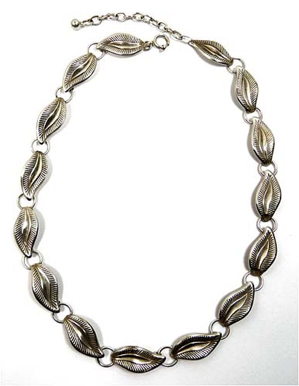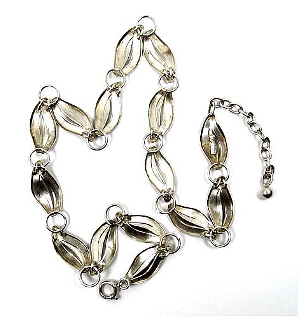 Silbernes Collier (835er), wo sich 15 blattartige Elemente jeweils mit ringförmigen Gliedern abwechseln. Ringösenverschluss mit Verlängerungskette. Länge ca. 45 cm, geputzter Zustand mit geringen Tragespuren. Gemarkt, wohl 30er Jahre.