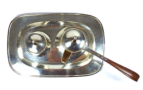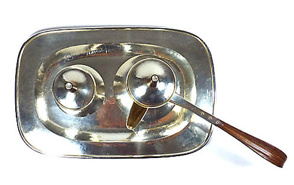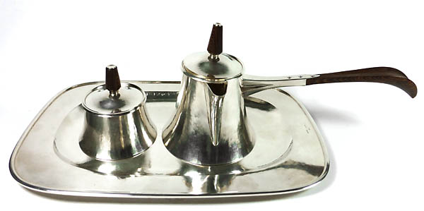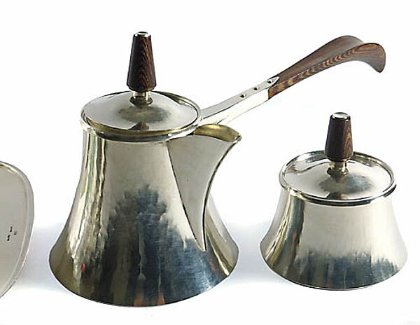 Handgefertigtes silbernes Service (900er), bestehend aus Tablett, Moccakanne und Zuckerdose. Handhaben aus Holz. Maße des Tabletts ca. 26,5 x 17,5 cm, Höhe der Zuckerdose ca. 7 cm, Höhe der Kanne ca.11 cm. Geputzter Zustand mit minimalen Gebrauchsspuren. Unterseitig jeweils Markung, wohl 1930er Jahre.