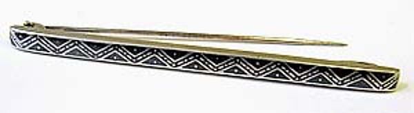 Bandförmiger Silberkorpus (800er), vorderseitig teilweise schwarz tauschiertes Zacken- und Punktedekor (Niello). Rückseitig einfache Broschierung. Länge ca. 7 cm, geringe Gebrauchsspuren. Ungemarkt, vermutlich Deutschland oder Österreich der 20er Jahre.