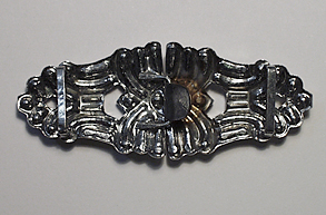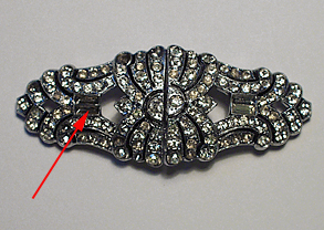 2-teiliger, nach außen sich verjüngender Metall-Korpus. Haken-Verbindung der beiden Teile. Außenseitig mit Straßsteinen besetzt, wovon einige fehlen, L. ca. 7 cm, Wohl um 1920 / 30.