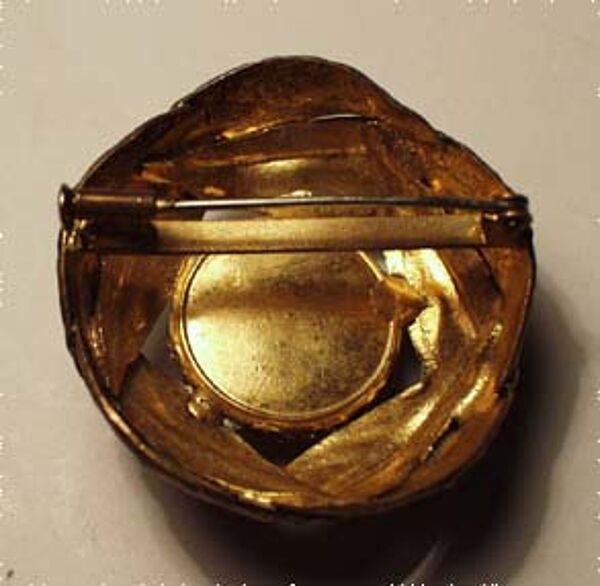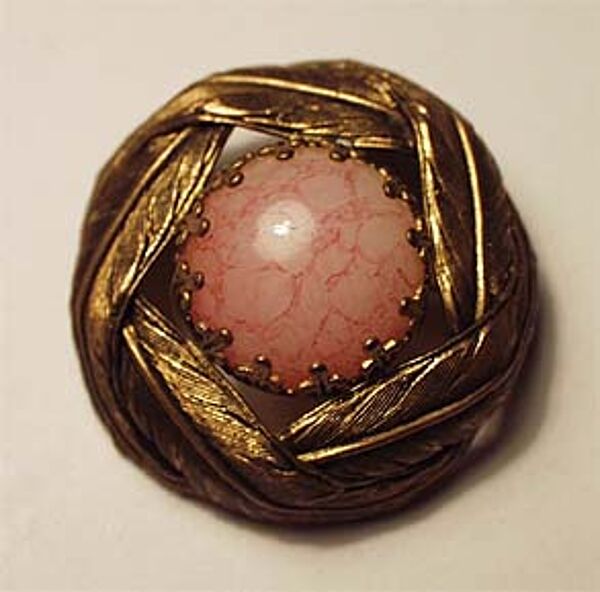 Runder, gewölbter, offen gearbeiteter, vergoldeter Messing(?)korpus in Form geflochtener Federn, die ausgesprochen filigran ausgearbeitet sind. Zentral ist ein rosa geädeter Glascabochon in Krappenfassung fixiert. Rückseitig Sicherheitsbroschierung mit Hülsenkopf. Durchmesser ca. 4 cm, Höhe: ca. 1,8 cm. Ungeputzter Zustand mit gleichmäßiger Patina. Wohl Deutschland der 20er Jahre.