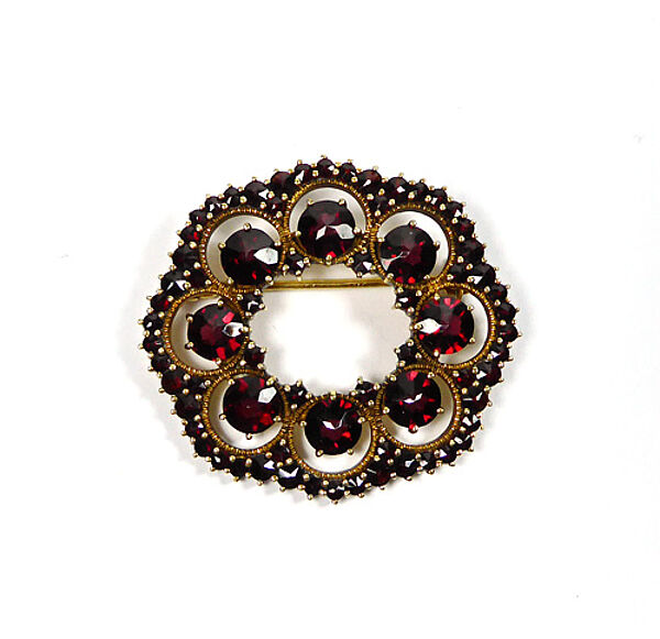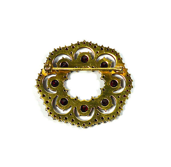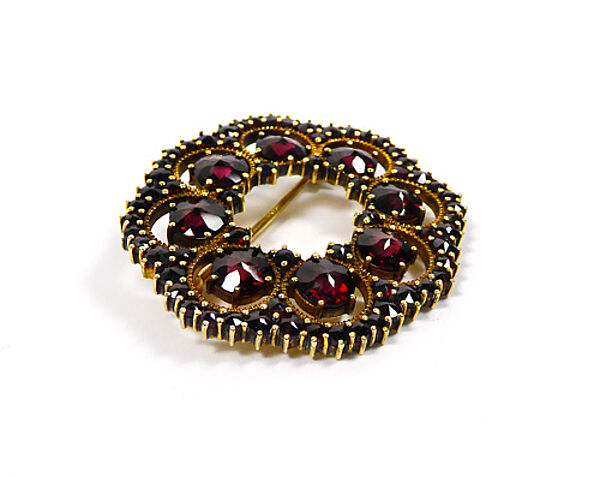 Fast scheibenförmiger bzw. angedeutet achteckiger offen gearbeiteter, vergoldeter Silberkorpus (900er), der durch acht faszettiert geschliffene, jeweils in einem Ringelement fixierte Granatsteine in Krappenfassung dominiert wird. Innen und außenseitig verläuft jeweils eine Reihe kleinerer Granatsteine. Maße ca. 4 x 3,6 cm, geringe Alters- bzw. tragespuren. Rückseitig Sicherheitsverschluss mit Kugelkopf. Ungemarkt, wohl Böhmen der 1910er, 20er Jahre.