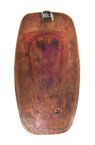 Annähernd hochrechteckige Kupferplatte mit leicht gewölbten Seitenkanten und abgerundeten Ecken. Vorderseitig polychrom emailliert: stilisiertes Motiv einer stehenden Madonna mit Kind in Zellenschmelztechnik. Maße ca. 27,5 x 15,5 cm, Randhöhe ca. 1 cm. Ungeputzter Zustand mit leichter Patina und geringen Altersspuren. Rückseitig ist am Oberrand eine Aufhängeöse angelötet. Wohl 1950er bis 70er Jahre.