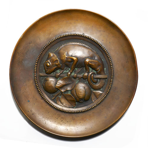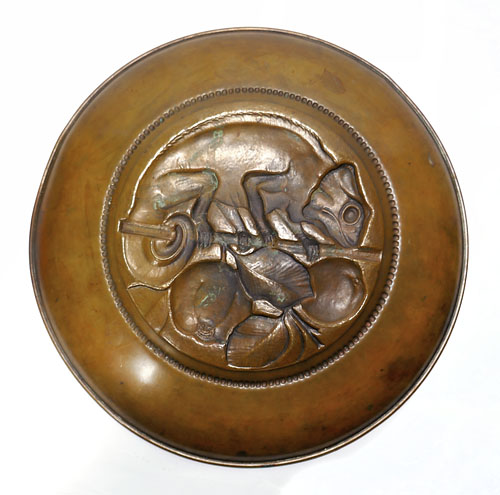 Wandteller aus Messing mit reliefierter Darstellung eines Chamäleons