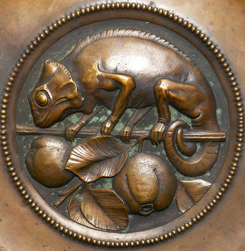 Flach schalenförmiger Messingkorpus mit breiter, glatter Fahne. Im Spiegel befindet sich ein mit einem Perlrand abgesetztes Hochrelief eines Chamäleons, welchses auf einem Zweig mit apfelartigen Früchten balanciert. Durchmesser ca. 27,2 cm, ungeputzter Zustand mit etwas ungleichmäßiger Patina und geringen Altersspuren. Wohl Deutschland der 1920, 30er Jahre.
