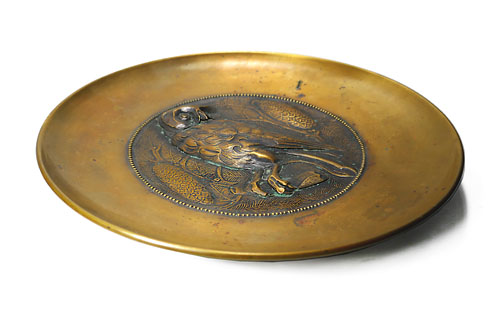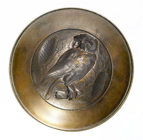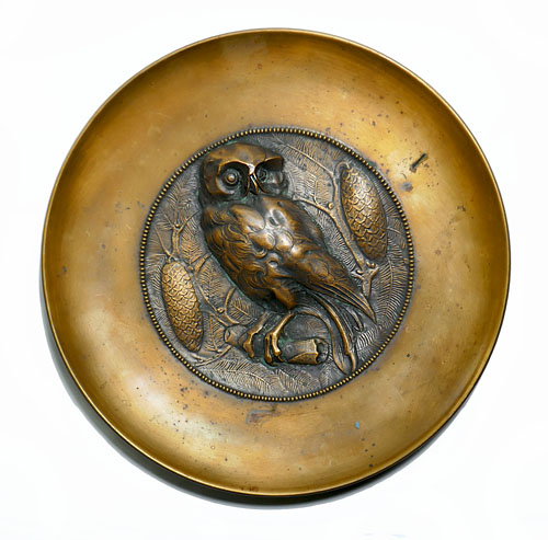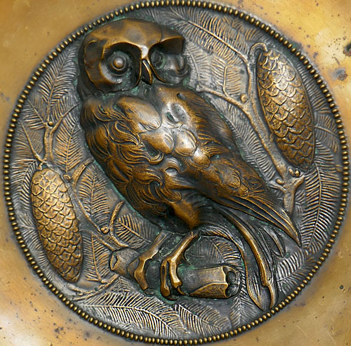 Wandteller aus Messing mit reliefierter Darstellung eines Kauzes oder einer Eule