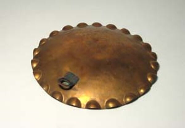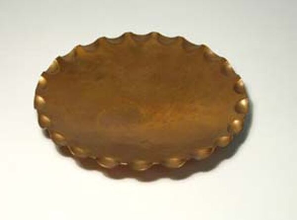 Flach schalenförmiger Korpus aus getriebenem Kupferblech mit relativ unruhigem Hammerschlag, im Randbereich Dekor-Reihe aus kleinen muldenförmigen Vertiefungen. Rückseitig Aufhängevorrichtung. Ungeputzter Zustand mit diskreten Gebrauchsspuren und leichter Patina. Ungemarkt, wohl Deutschland der 20er, 30er Jahre.Durchmesser ca. 17 cm.