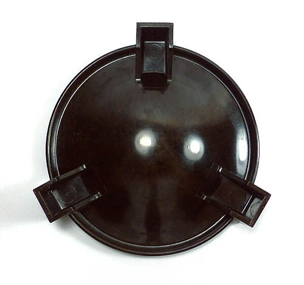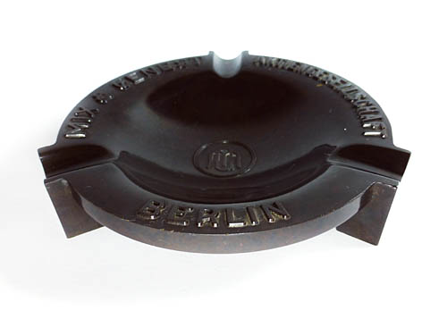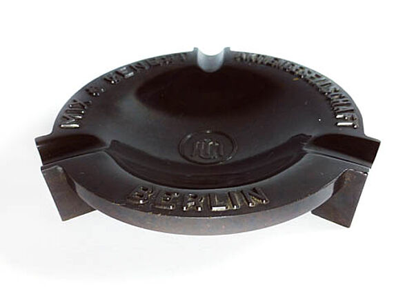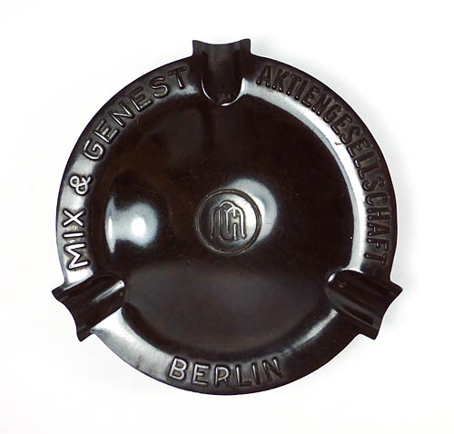 Flach schalenförmiger, dunkelbrauner Bakelit-Korpus auf drei Füßen (hier befindet sich jeweils oberseitig die Muldung für die Zigaretten), im Randbereich flach erhabene Bezeichnung "MIX & GENEST AKTIENGESELLSCHAFT BERLIN". Durchmesser ca. 12,5 cm, mit 3 Zigarettenauflagen 6 mm über Außenrand stehend, Höhe ca. 2,7 cm, geringe Gebrauchsspuren. Wohl 1920er Jahre.