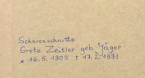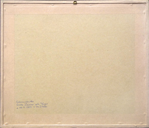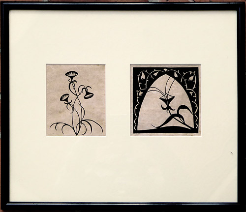 Zwei Scherenschnitte jeweils florale Motive - hinter neuzeitlicheren Passepartout, gerahmt mit schwarz gefasster, einfacher Holzleiste, rückseitig von fremder Hand Angaben zur Künstlerin. Rahmenaußenmaße ca. 42,5 x 37 cm, geringe Altersspuren. Wohl 1930er bis 50er Jahre.