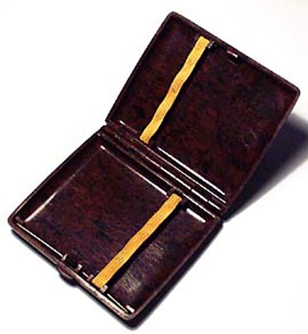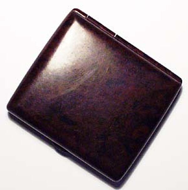 "Schnörkelloser", quadratischer, flacher Korpus aus braunem, leicht marmorierten Bakelit. Feder-bzw. Schnappverschluss, innen Gummmiband mit Alterspuren (ansonsten aber tadelloser Zustand). Maße ca. 8 x 8,7 cm. Wohl Deutschland der 20er/30er Jahre.