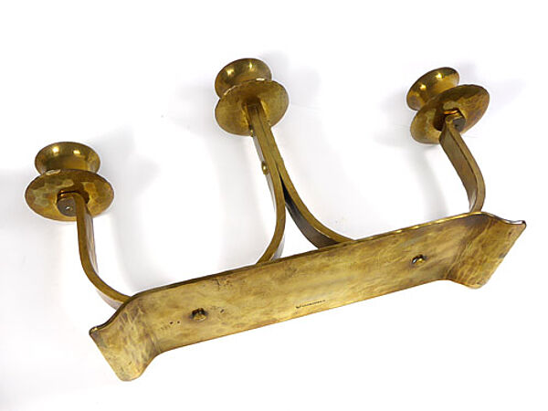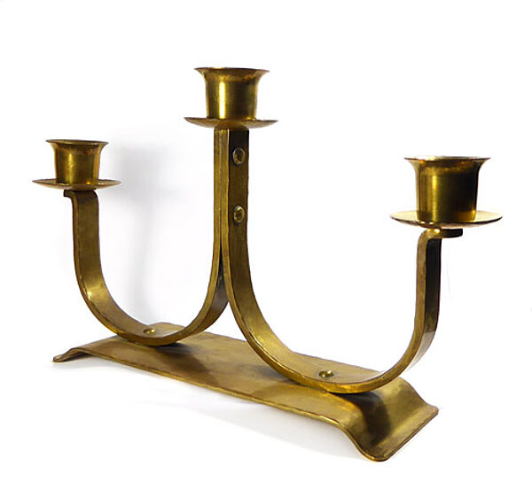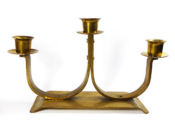 Handgeschmiedeter Messingkorpus: auf einem rechteckigen, beidseits gefußten Sockel sind zwei nach oben geöffnete, U-förmige Bandelemente genietet, die insgesamt drei Kerzenhalter mit jeweils Tropfschale tragen. Maße ca. 33 x 20 cm, ungeputzter Zustand mit leichter Patina und geringen Gebrauchsspuren. Unterseitig gemarkt, wohl 1930er Jahre.