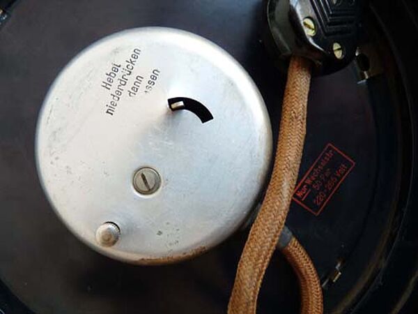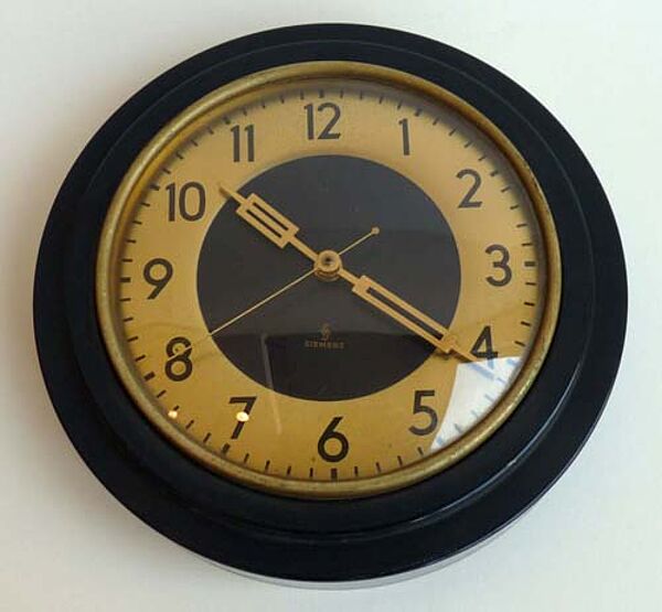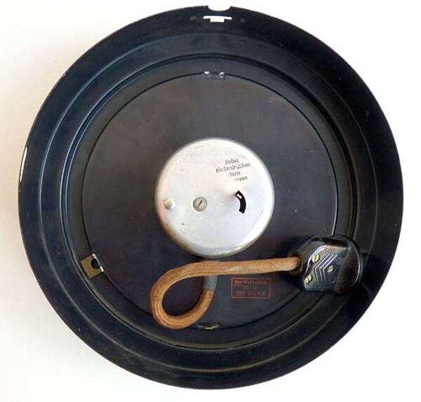 Scheibenförmiger Korpus aus schwarz lackiertem Metall, das leicht gewölbte Uhrenglas wird durch einen Messingring gefasst. Schlicht arabische Zahlen, geschlitzte Minuten- bzw. Stunden- und filigraner Sekundenzeiger. Hier Firmen-Signet. Durchmesser ca. 21 cm, Tiefe ca. 6 cm, geringe Gebrauchsspuren. Rückseitig Uhrwerk in zylindrischem Aluminiumgehäuse (Funktion nicht geprüft), Stecker mit stoffumwickeltem Kabel sowie Bezeichnung "Nur Wechselstrom 50 Per 220 - 265 Volt". Wohl 30er Jahre.