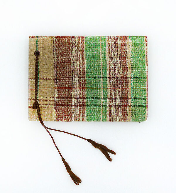 Querrechteckiges, leeres Fotoalbum mit wohl handgewebtem (!) Umschlag (Leinenbindung), hierbei handelt es sich um Flachgewebe (Baumwolle/Leinen) in Grün-, Braun- und Beigetönen. Maße ca. 13 x 18 cm, geringe Altersspuren. Stark von der Bauhausästhetik beeinflusstes Dekor, wohl Deutschland der 1920er Jahre.