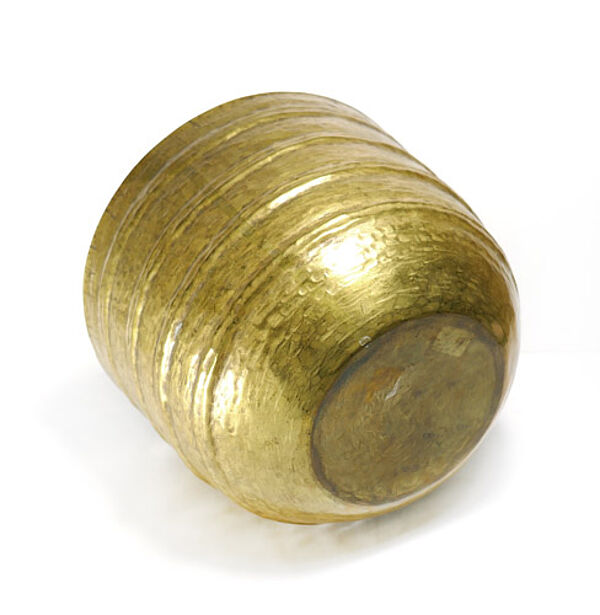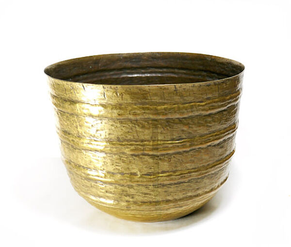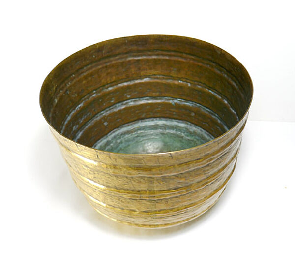 Getriebener, sich konisch leicht erweiternder Messingkorpus, vierfach horizontal gerippt, Strukturdekor, leicht expressives Hammerschlagdekor. Höhe ca. 14,5 cm, Durchmesser ca. 19 cm, ungeputzter Zustand mit außen geringer, innen deutlicherer Patina und geringen Altersspuren. Am Rand gemarkt. Wohl 1930er, 40er Jahre. Provenienz: Sammlung Giorgio Silzer.
