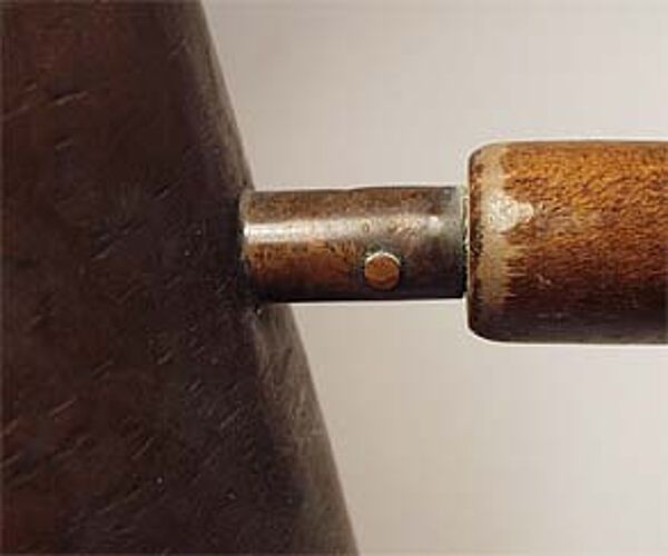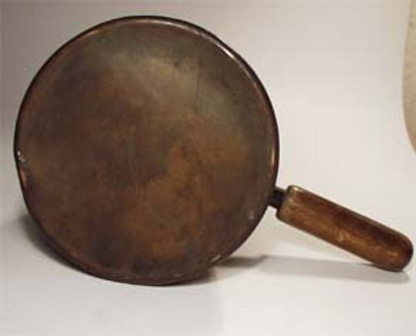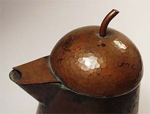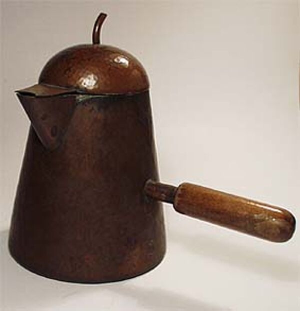 Kegelförmig sich nach oben verjüngender Korpus aus getriebenem Kupferblech, stabförmige Handhabe mit Holzgriff. Deckel in Halbkugelform, auf dem Zenit gebogen-stielförmige Handhabe. Höhe ca. 17,5 cm. Warme Patina des Metalls, kleine Delle bodenseitig. Beim Holzgriff ist partiell der Lack abgegriffen. Wohl Deutschland der 20er Jahre.