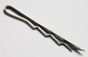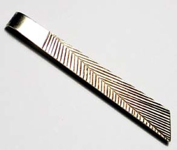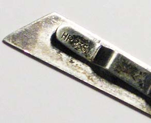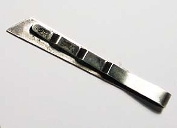 Spangenförmiger Silberkorpus (835er), vorderseitig gepunztes Strich-Dekor, rückseitig gemarkt "HP". Länge ca. 6 cm, ungeputzter Zustand mit minimalen Gebrauchsspuren. Wohl 20er, 30er Jahre.