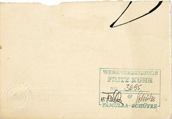 Mischtechnik auf festem Papier, rechts unten handsigniert. Blattmaße ca. 14,5 x 10 cm, Bildmaße ca. 10,5 x 9 cm, geringe Alters-, Griff- und Lagerspuren auf. Rückseitig Werkverzeichnis-Stempel mit handschriftlichem Eintrag der WVZ-Nr. "3695" sowie Unterschrift der beiden Nachlassverwalter Famulla und Schütze. Wohl um 1945 bis 47.