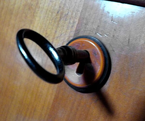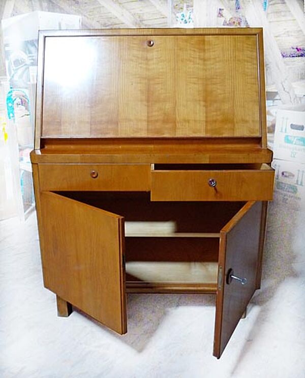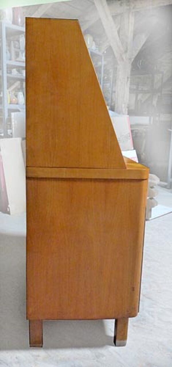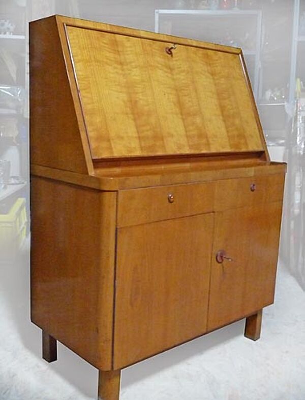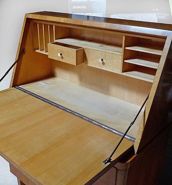 Hell (Birke) furnierter Holzkorpus auf vier schlanken Beinen. Originale Beschläge (metallgefasste orange-braune Kunststoffscheiben) und Schlösser (nur die Schlüssel sind zwar alt, aber nicht original). Maße: Höhe ca. 125 cm, Tiefe ca. 45 cm, Breite ca. 95 cm. Geringe bis moderate Altersspuren, so zeigen sich einzelne Flecke im Bereich des Innenlebens. Herstellerschild an der Innenseite einer Tür. Wohl Ende der 1920er, Anfang der 1930er Jahre (auf jeden Fall vor 1944).