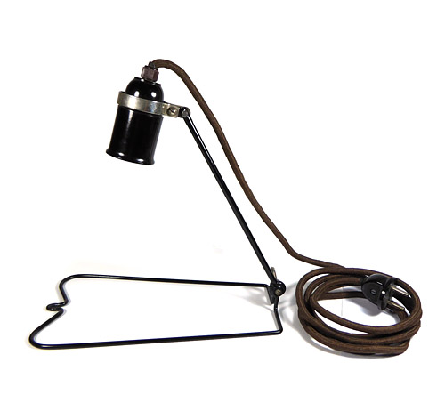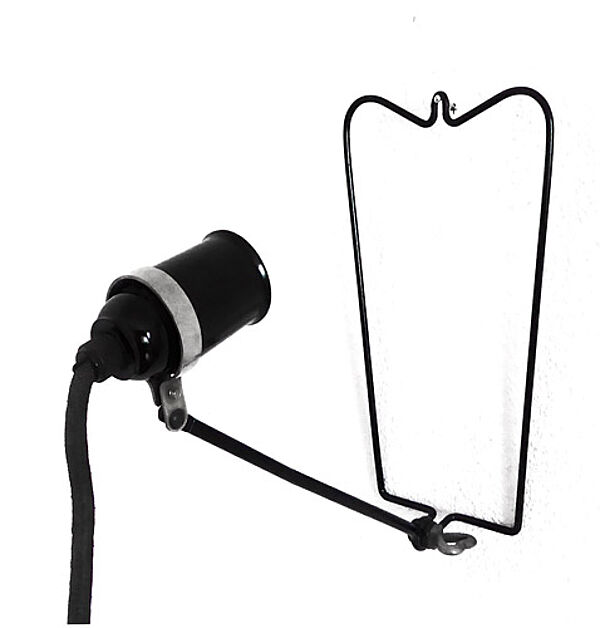 Gestell aus schwarz lackiertem, kräftigem Metalldraht, wobei ein flügelartig gebogener Fuß, der auch zur Aufhängung an der Wand geeignet ist, über ein Gelenk (dieses kann mit einer herzförmiger Flügelmutter verfestigt werden) mit dem Arm für die Bakelitfassung verbunden ist. Die Fassung wird durch eine reifenartige Stahlspange gehalten; mit braunem Stoff ummanteltes Kabel, einfacher Bakelitstecker. Maße ca. 23 x 28 x 13 cm, geringe Gebrauchsspuren (die Funktion kann aber von uns nicht garantiert werden), wohl Deutschland der 1920er bis 40er Jahre.