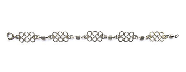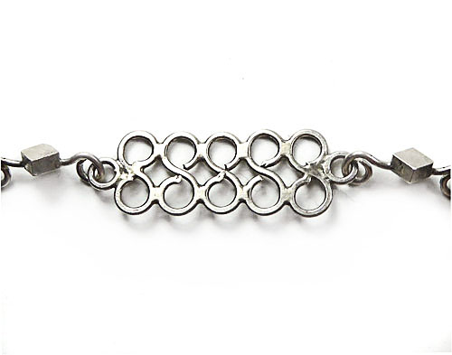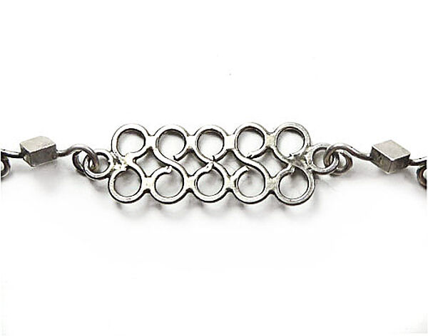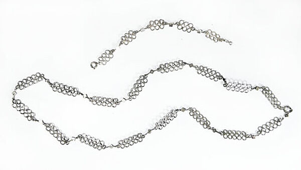 Lange Gliederkette und Armband aus Silber (925er). Es wechseln sich dominante, annähernd rechteckig konfigurierte Elemente aus 5 verlöteten S-förmigen Schlaufen mit kleinen Verbindungsgliedern ab, die mittig einen kleinen Quader integriert haben. Jeweils Ringösenverschluss. Länge der Kette ca. 80 cm, Länge des Armbandes ca. 19 cm, geringe Tragespuren. Gemarkt, wohl 1940er, 50er Jahre.