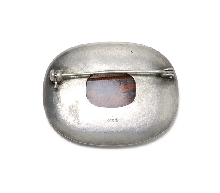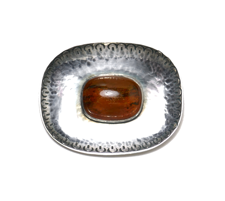 Getriebener, annähernd rechteckiger, gewölbter Silber-Korpus (835er) mit abgerundeten Ecken. Im Randbereich gepunzte Zierkante. Zentral bernsteinfarbener Cabochon in Zargenfassung. Maße ca. 4 x 3,3 cm. Geringe Gebrauchsspuren. Rückseitig Sicherheitsbroschierung mit Kugelkopf sowie ungeutete Markung. Wohl Deutschland der 20er/30er Jahre.
