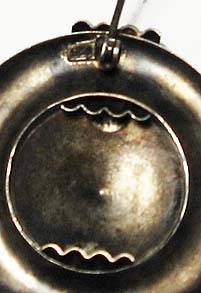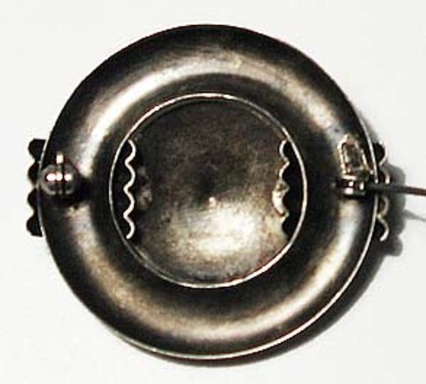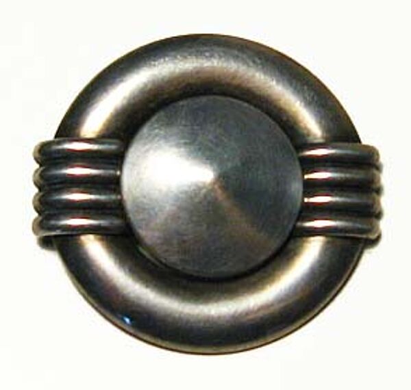 In der Grundform scheibenartiger Silberkorpus (925er), der sich aus einem zentralen, flach-kegelförmigen und einem äußeren, ringförmigen Element zusammensetzt. Letzteres wird durch ein Band kleiner, parallel verlaufenderStege in zwei Hälften gegliedert bzw. hierduch die plastische Wirkung der Brosche verstärkt. Durchmesser ca. 3,7 cm, ungeputzter Zustand mit geringen Gebrauchsspuren. Rückseitig Sicherheitsbroschierung mit Kugelkopf. Wohl Deutschalnd der 20er, 30er Jahre.