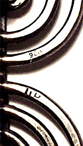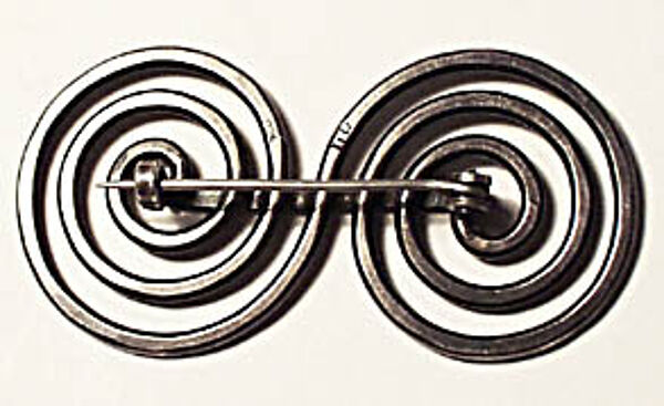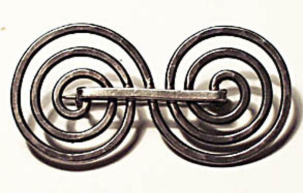 Der Korpus besteht aus zwei gegenläufigen, ineinander übergehenden Spiralen aus martelliertem Silberdraht (900er). Länge ca. 4,7 cm, Höhe ca. 2,5 cm. Ungeputzter Zustand mit geringen Tragespuren. Rückseitig einfache Broschierung und Markung. Wohl Ende der 30er Jahre.