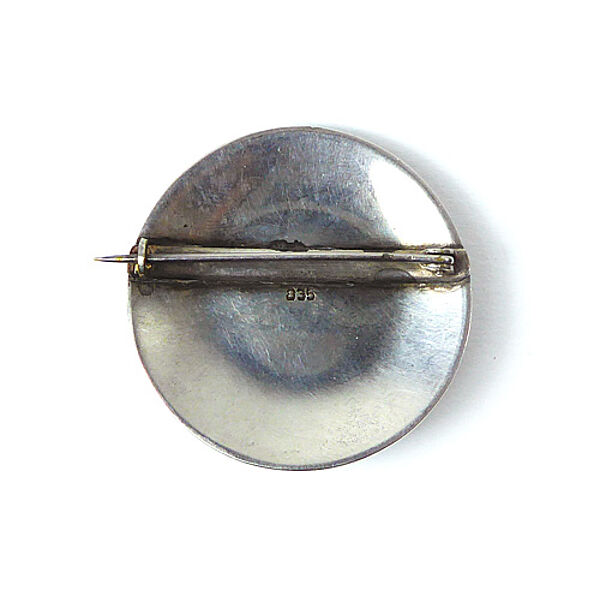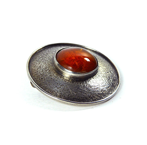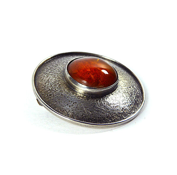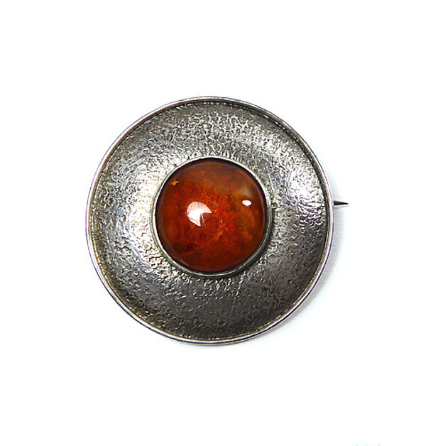Scheibenartiger, leicht gewölbter Silberkorpus (835er), außenseitig feiner Rand, mittig braun-orange-farbener, luzider Bernstein-Cabochon in Zargenfassung. Die Oberfläche dazwischen ist fein genarbt. Durchmesser ca. 3,8 cm, ungeputzter Zustand mit leichter Patina und geringen Tragespuren. Rückseitig einfache Broschierung. Ungemarkt, wohl Deutschland der 1920er, 30er Jahre.