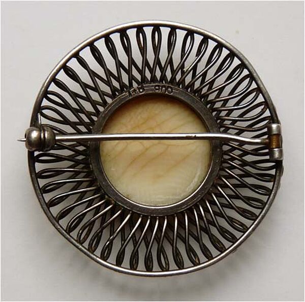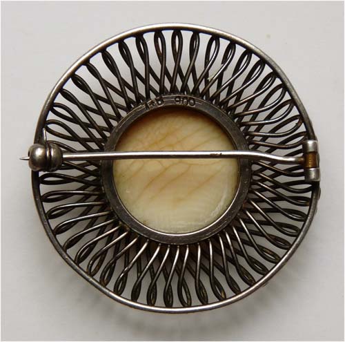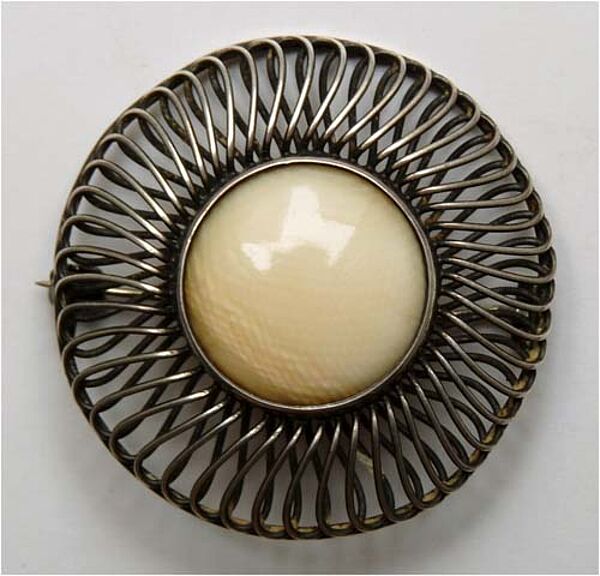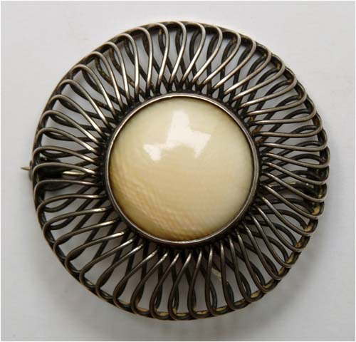 Scheibenförmiger, offen gearbeiteter Korpus aus Silberdraht (900er), der schlaufenförmig um einen zargengefassten Elfenbein-Cabochon angeordnet ist. Durchmesser ca. 3,5 cm, ungeputzter Zustand mit dunkler Patina und moderaten Gebrauchsspuren (z.T. minimale Draht-Verbiegung, siehe Foto). Rückseitig gemarkt "T+B" (ungedeutet) sowie Sicherheitsbroschierung mit Kugelkopf. Wohl Deutschland der 20er Jahre.
