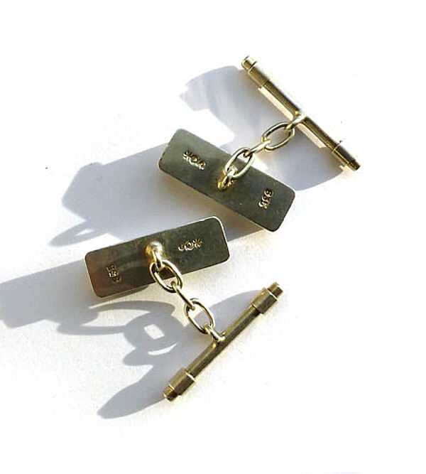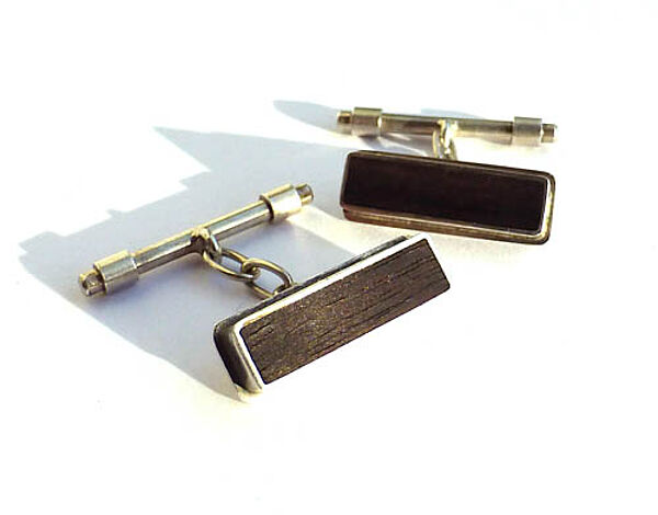 Handgefertigter Silberkorpus (835er), in Form eines doppelseitigen Knebels, wobei der eigentliche bzw. schauseitige, rechteckige Knopf durch zargengefasstes Ebenholz gebildet wird. Dessen Maße betragen ca. 2,2 x 0,8 cm, Länge des Gegenstücks ca. 2,7 cm, Kettenlänge ca. 2 cm. Ungeputzter Zustand mit geringen Tragespuren. Entwurf wohl 1930er Jahre, wobei Otto Scharge die Knöpfe auch noch viele Jahre danach "im Sortiment" hatte.