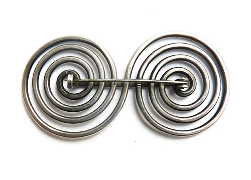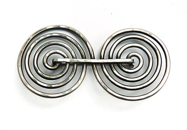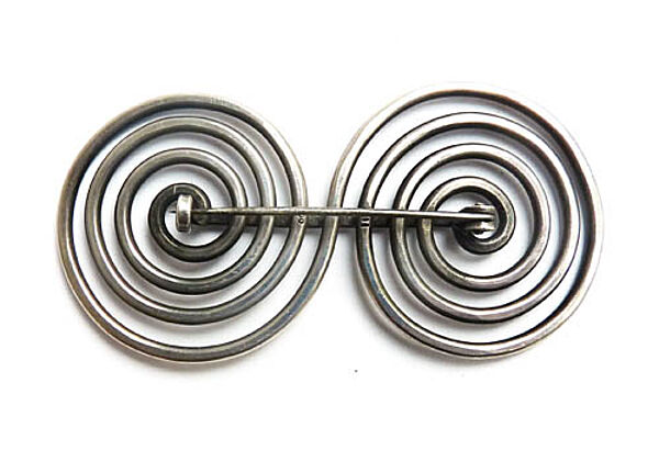 Der Korpus besteht aus zwei gegenläufigen, ineinander übergehenden Spiralen aus martelliertem Silberdraht (900er). Breite ca. 6 cm, Höhe ca. 3 cm. Ungeputzter Zustand mit geringen Tragespuren. Rückseitig einfache Broschierung und Markung. Entwurf wohl Ende der 30er, vielleicht auch erst Anfang der 50er Jahre, ausgeführt wurde die "Schneckenbrosche" bis in die 70er Jahre (ich danke Herrn Warmuth für die Informationen).