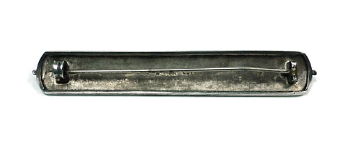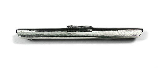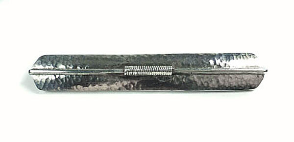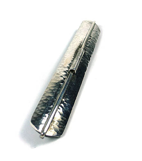 Bandförmiger Silberkorpus (800er) mit mit abgerundeten Ecken und fein martellierter Oberfläche, hier über die gesamte Länge aufgelegter schmaler Steg, der mittig ein zierliches Spiralelement trägt. Länge ca. 7 cm, Breite ca. 1,2 cm, geputzter Zustand mit geringen Tragespuren. Rückseitig Bezeichnung "HANDARBEIT" und Sicherheitsbroschierung mit Kugelkopf. Ungemarkt, wohl Deutschland der 1920er, 30er Jahre.