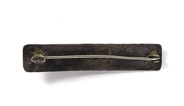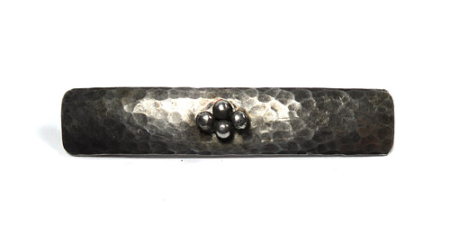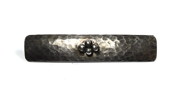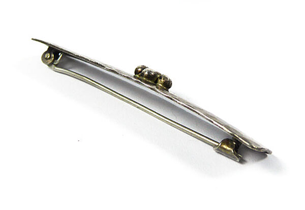 Handgetriebener, bandförmiger, leicht gewölbter Silberkorpus (835er) mit "Hammerschlag"-Dekor. Vorderseitig sind mittig vier kleine Kugelelemente aufgebracht. Länge ca. 5,5 cm, ungeputzter Zustand mit moderater, fast gleichmäßiger Patina und geringen Tragespuren. Rückseitig einfache Broschierung sowie Bezeichnung "HANDARBEIT". Wohl Deutschland der 1920er Jahre.