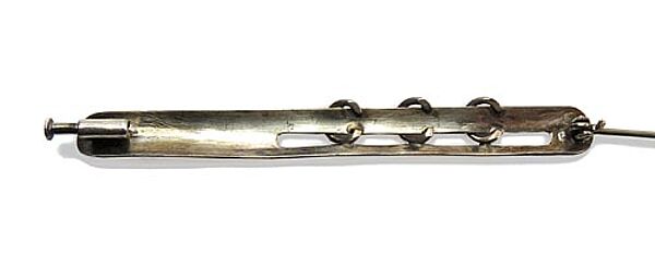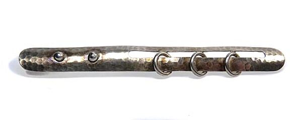 Handgetriebener, leicht konvexer Silberkorpus (geprüft) mit abgerundeten Ecken. Die Oberfläche weist einen leichten Hammerschlag auf. An einem Rand sind zwei kleine Halbkugelelemente aufgesetzt. Die andere Hälfte ist geschlitzt, hier sind drei Ringelemente eingehängt. Maße ca. 7,2 x 0,8 cm, ungeputzt Zustand mit leichter Patina und moderaten Tragespuren (so ist der relativ dünnwandige Korpus minimal verbogen). Rückseitig Sicherheitsbroschierung mit Zylinderkopf. Ungemarkt, wohl Deutschland der 20er, 30er Jahre.