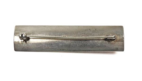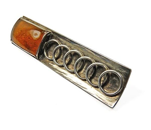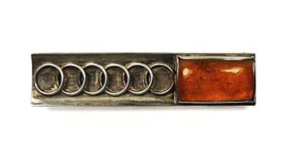 Handgearbeiteter, bandförmiger, leicht konkaver Silberkorpus (925er), vorderseitig wird ein äußeres Viertel von einem rechteckig gemugelten, bräunlichen, luziden Bernstein-Cabochon in Zargenfassung eingenommen. Der übrige Korpus trägt 6 sich am Rand überlappende, grafisch wirkende Ringelemente. Maße ca. 6 x 1,4 cm, ungeputzter Zustand mit deutlicherer, etwas ungleichmäßiger Patina und geringen Tragespuren. Rückseitig Sicherheitsbroschierung mit Kugelkopf. Ungemarkt, wohl Deutschland der 20er, 30er Jahre.