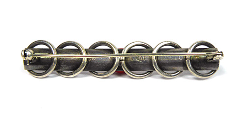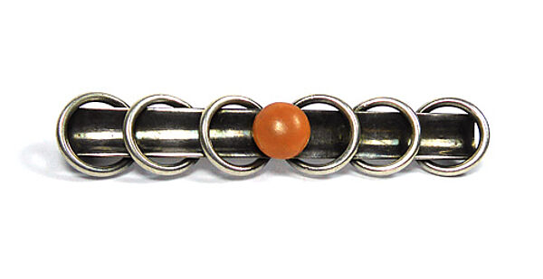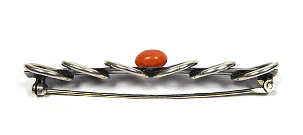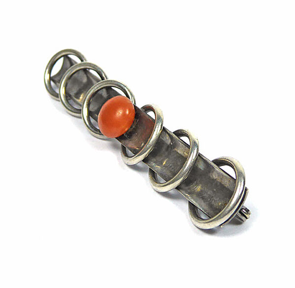 Silberner Korpus (835er): eine gemuldete, leicht konvex gewölbte Schiene, trägt sechs Ringelemente, mittig ist eine lachsrote Korallenperle aufgesetzt. Länge ca. 7 cm, ungeputzter Zustand mit leichter Patina sowie geringen Alters- und Tragespuren. Rückseitig Sicherheitsbroschierung mit Kugelkopf, Markung und Bezeichnung "HANDARBEIT". Wohl Deutschland der 1920er, 30er Jahre.