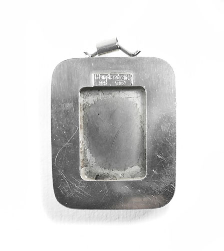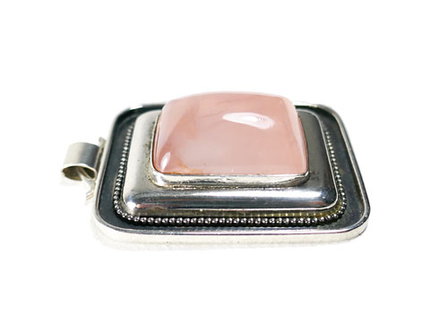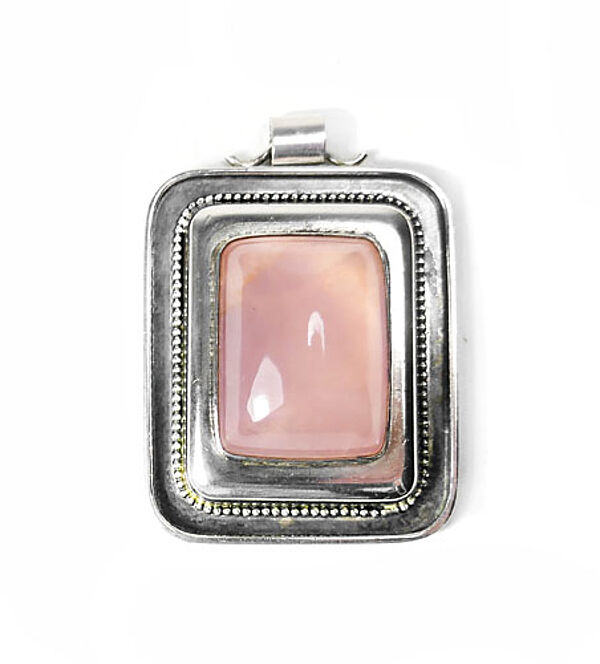 Handgearbeiteter, hochrechteckiger Silberkorpus (925er) mit abgerundeten Ecken, vorderseitig dominiert ein ebenfalls hochrechteckiger Rosenquarz-Cabochon in Zargenfassung, zudem kann man eine den Stein einrahmende Zier- bzw. Perlleiste ausmachen. Oberseitig recht dominante, bewegliche Öse, hier rüchseitig gemarkt, großer Rosenquarz- Cabochon. Maße ca. 4,2 x 3,5 cm, Länge mit Öse ca. 5 cm, alt geputzter Zustand mit diskreter Patina und leichten Tragespuren. Rückseitig Markung. Entwurf wohl 1930er Jahre, Ausführung evtl. später.