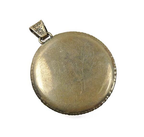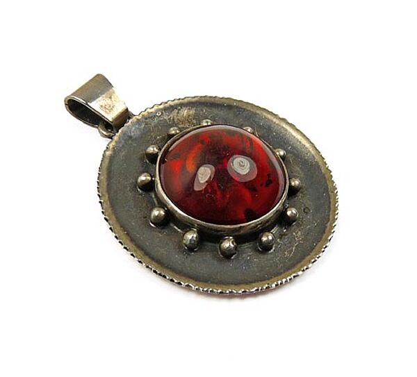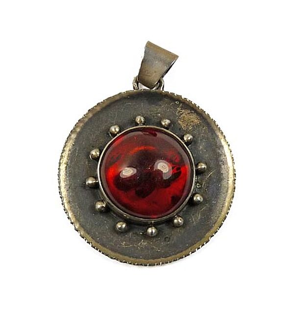 Scheibenförmiger, flach konkaver Silberkorpus (835er), der zentral einen runden, rötlich-braunen, luziden Bernstein-Cabochon in Zargenfassung trägt, auf die kleine Kugelelemente aufgesetzt sind. Oberseitig kräftige, nach unten sich leicht verjüngende, bewegliche Öse. Länge mit Öse ca. 4,8 cm, ohne Öse ca. 3,7 cm, ungeputzter Zustand mit z.T. deutlicherer Patina und eher geringen Tragespuren. Rückseitig an der Öse gemarkt sowie Prüf(?)-Nummer "T8", wohl 30er bis 50er Jahre.