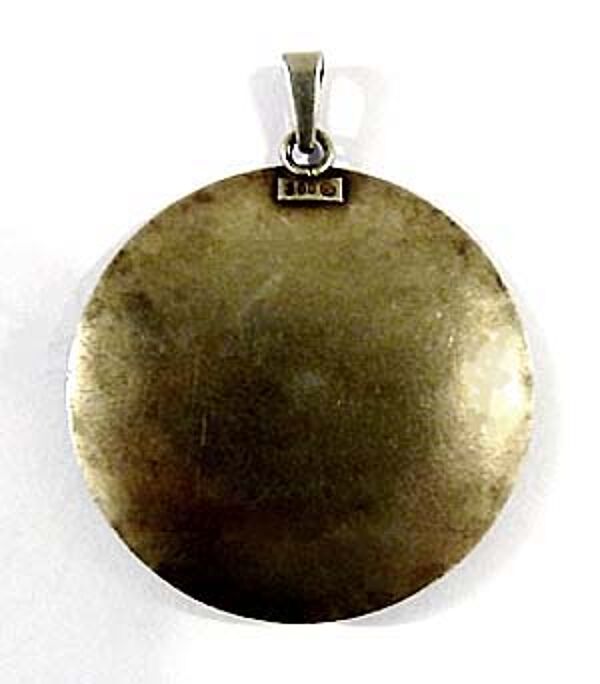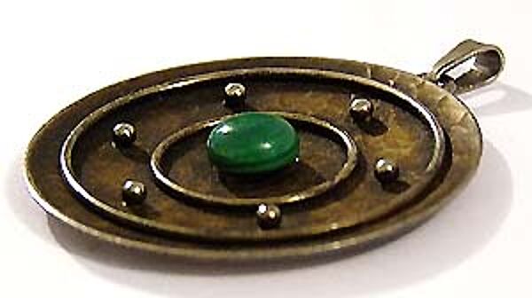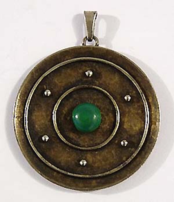 Handgetriebener, scheibenförmiger, leicht konkaver Silberkorpus (800er) dem vorderseitig zwei (ein größeres und ein kleineres) Ring- und mehrere Kugelelemente sowie mittig ein grüner, abgeflacht-perlenförmiger (Halbedel?)Stein aufgesetzt wurden. Oberseitig einfache, sich nach unten leicht verjüngende, bewegliche Öse. Durchmesser ca. 4 cm (ohne Öse), ungeputzter Zustand mit deutlicherer Patina und geringen Tragespuren. Rückseitig gemarkt (ungedeutet), wohl Deutschland der 20er Jahre.