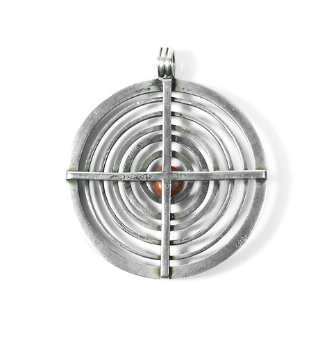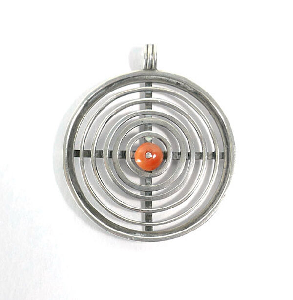 Offen gearbeiteter Silberkorpus (835er): auf zwei rückseitigen, kreuzartig angeordneten Stegen sind konzentrisch Ringelemente im gleichmäßigen Größenverlauf angeordnet, im Zentrum ist eine gestiftete lachsrote Korallenperle fixiert. Oberseitig starre Öse. Durchmesser ca. 3,5 cm, ungeputzter Zustand mit geringen Tragespuren. Ungemarkt, wohl Deutschland der 1920er Jahre.