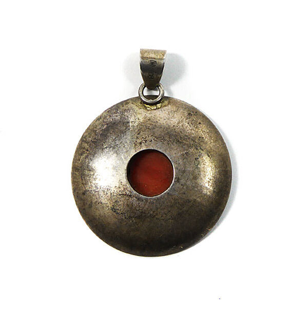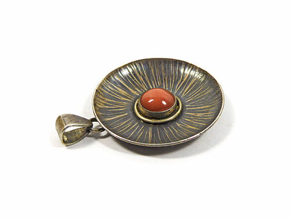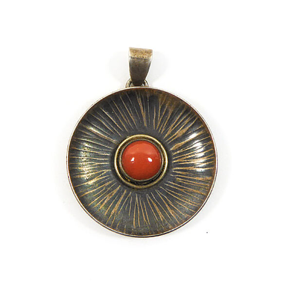 Schalenartiger Silberkorpus (800er) mit vorderseitig feinem, teilweise geschwärzten Streifendekor, mittig ist hier ein lachsroter Korallen-Cabochon in Zargenfassung integriert. Oberseitig einfache, dreieckig konfigurierte, bewegliche Öse (hier gemarkt). Durchmesser ca. 3,2 cm, Länge mit Öse ca. 4 cm, ungeputzter Zustand mit leichter Patina und geringe Tragespuren. Wohl 1920er, 30er Jahre.