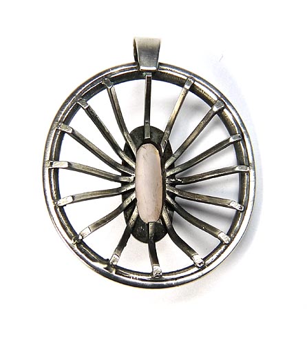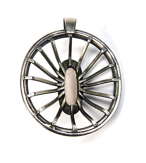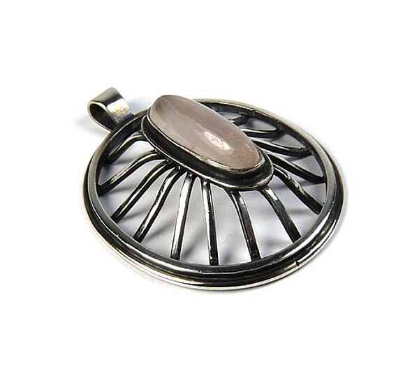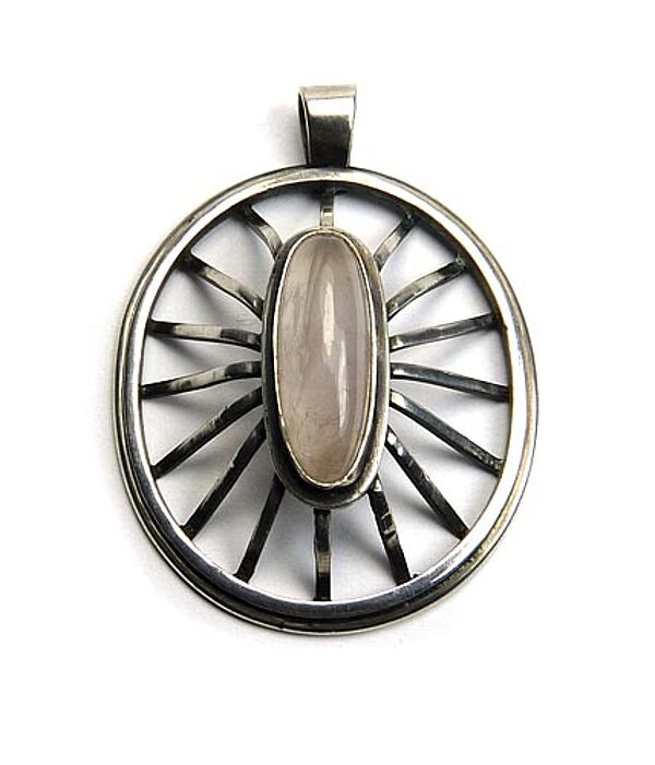 Der hoch-ovale, offen gearbeitete, gewölbte Silberkorpus (geprüft) wird von einem profilierten Steg umrahmt. Von diesem gehen radspeichenartig Stege zu einem mittigen, ovalären Rosenquarz-Cabochon in Zargenfassung. Oberseitig einfache, starre Öse. Länge mit dieser ca. 4,5 cm, Länge ohne Öse knapp 4 cm, geputzter Zustand mit geringen Tragespuren. Ungemarkt, wohl Deutschland der 30er Jahre. wir hatten ein ähnliches, mittlerweile verkauftes Stück im Bestand, welches nach Angabe seines Vorbesitzers eine Arbeit von Wolfgang Tümpel war. Im Katalogbuch "Wolfgang Tümpel, 1903 - 1978 - Ein Bauhauskünstler aus Bielefeld" (von Hildegard Wiewelhove vom Museum Huelsmann Bielefeld) sind zudem formähnliche Arbeiten zu sehen, siehe Katalog-Nr. 88, 91 und 95.