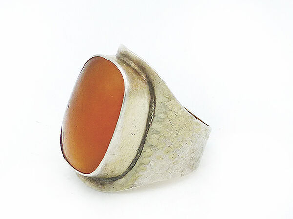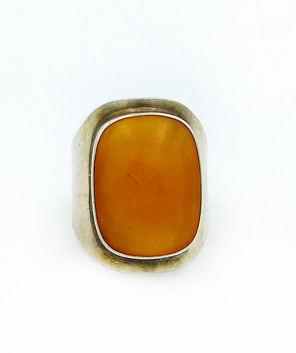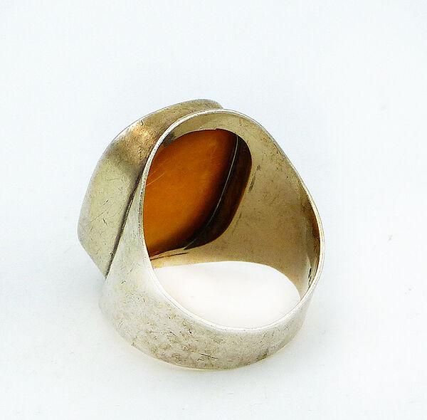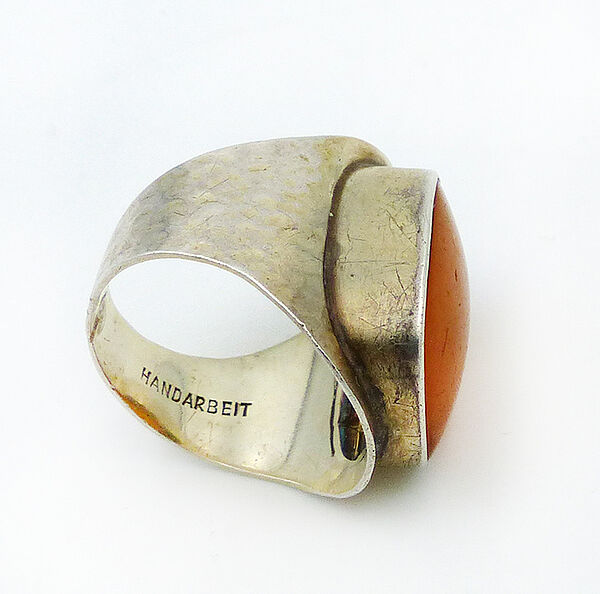 Handgetriebener Silberkorpus (geprüft): die breite Ringschiene mit fein martellierter Oberfläche verbreitert sich beidseits allmählich bis zur Schulterregion. Der Ringkopf wird durch einen hoch-ovalen, orange-braunen, semiluziden Bernsteincabochon in breiter Zargenfassung gebildet (hier rückseitig offen gearbeitet). Stein-Maße ca. 2 x 1,5 cm, Ringinnendurchmesser ca. 1,9 cm. Innen bezeichnet "HANDARBEIT", ungemarkt, wohl Deutschland der 1920er Jahre, die Formnähe zu Toni Koy könnte evtl. Hinweis auf Königsberg als Entstehungsort sein.