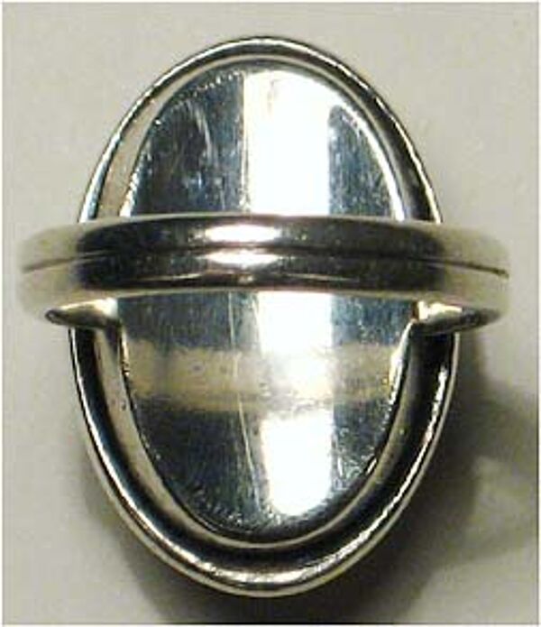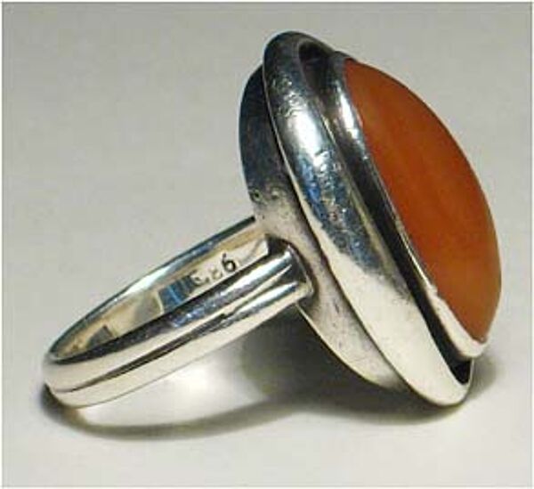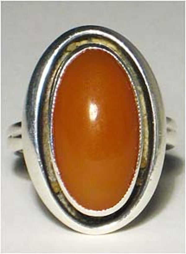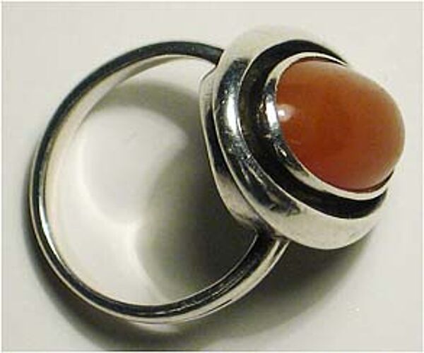 Ring aus 935er Silber mit ovalärem, relativ dominanten Ringkopf, der zentral ein Karneol-Cabachon in Zargenfassung trägt. Durchmesser des Ringkopfes ca. 2,3 cm und des Karneols ca. 1,8 cm, Ringinnendurchmesser ca. 1,6 cm, insgesamt moderate Gebrauchsspuren. Wohl Deutschland der 20er Jahre.